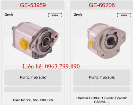Bán bơm thủy lực xe nâng người Genie: S60, S65, S80, S85, GS1930, GS2032, GS2632, GS3246. Hàng chính hãng, uy tín, chất lượng.