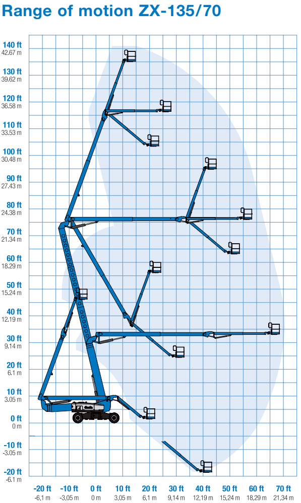 Xe nâng người 43 m Z boom ZX135/70 là xe thang nâng người có chiều cao lớn nhất trong dòng xe nâng người Boom lift với chiều cao làm việc lên tới 43, 15m, tầm với ngang 21,26m. Xe nâng người ZX135/70 cho phép tiếp cận chiều cao và tầm với lớn, những nơi mà xe nâng người cần ống lồng thuần túy không thể tiếp cận. Xe lý tưởng phụ trợ trong ngành công nghiệp và các công việc ngoài trời. ZX135/70 sử dụng hệ thống Mini Genie X – Chassis cho phép mở rộng hay thu hẹp chân giúp nâng cao sự ổn định khi làm việc hay thu hẹp thuận lợi cho việc di chuyển.