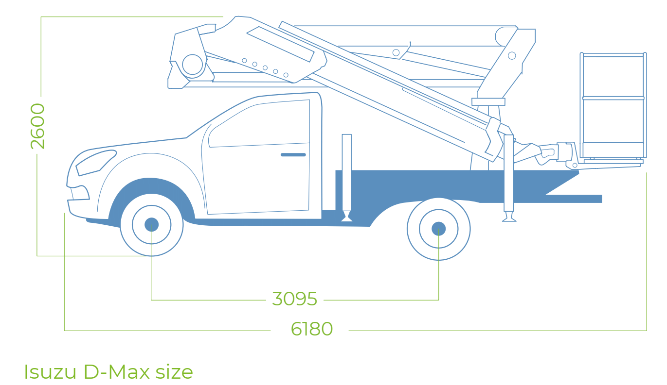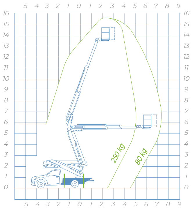 Xe bán tải nâng người 16 m đạt độ cao làm việc lên tới 15,5 m, tầm với ngang đạt 7,3 m và sức nâng của giỏ có thể đạt đến 250 kg (bao gồm 2 người cộng vật liệu), khả năng quay giỏ là 90 độ trái và 90 độ phải.